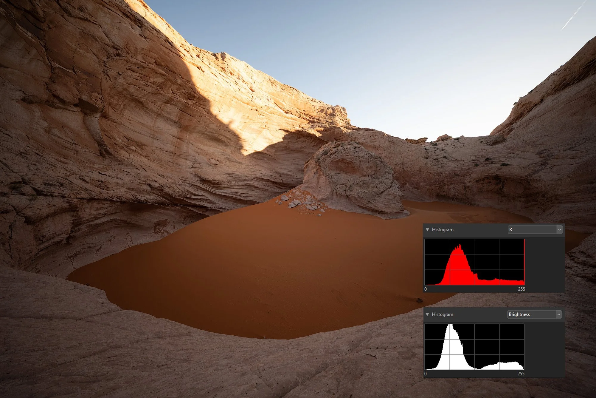 Your histogram can only show data within the 0–255 scale. If the dynamic range of the scene exceeds what your sensor can capture, the histogram can’t tell you how much is being lost — only that some is beyond the edges. This is why techniques like bracketing are necessary for extreme contrast situations.Color Channel Nuance