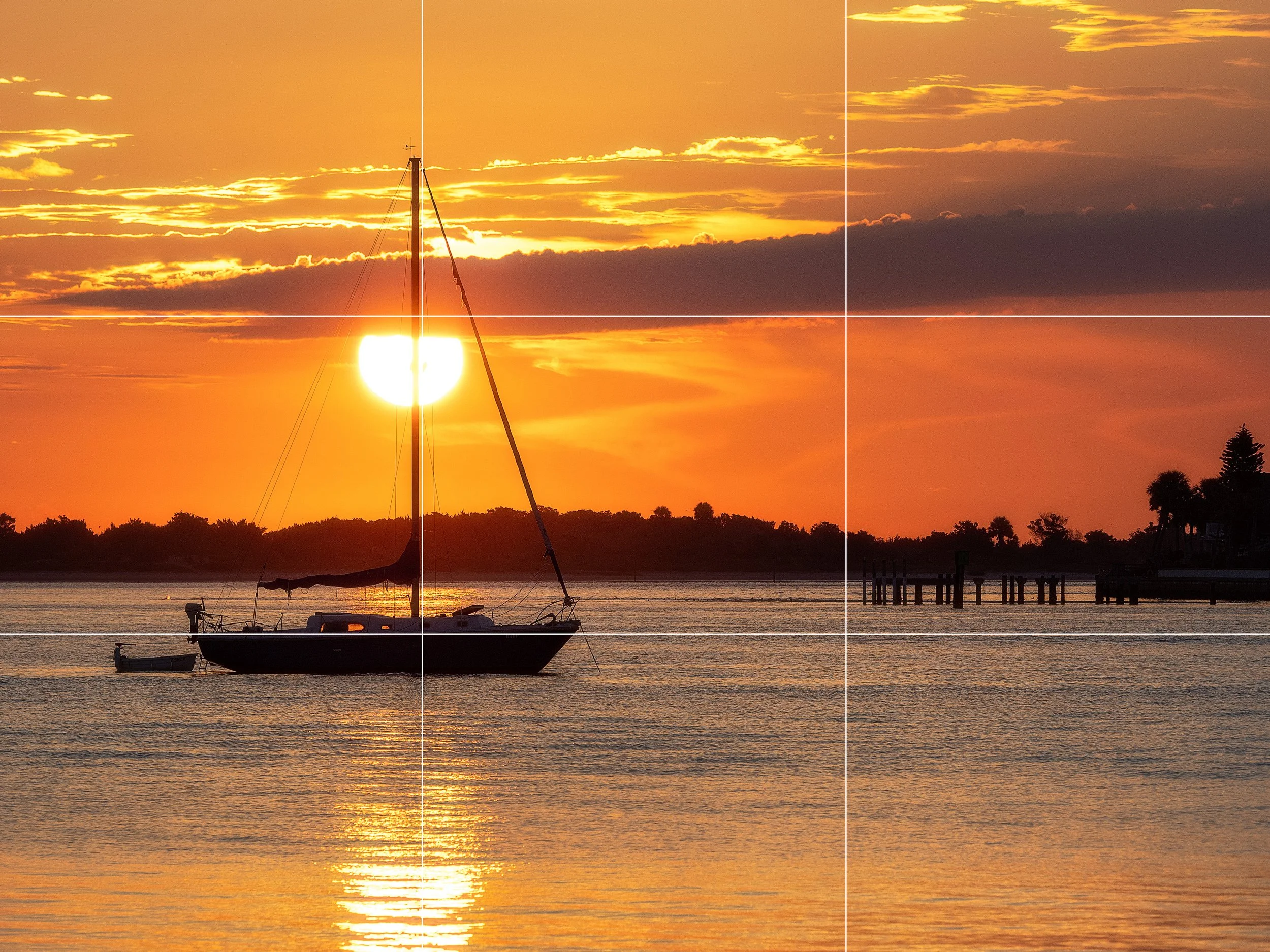 This sunrise photo of a sailboat is framed intentionally using the rule of thirds