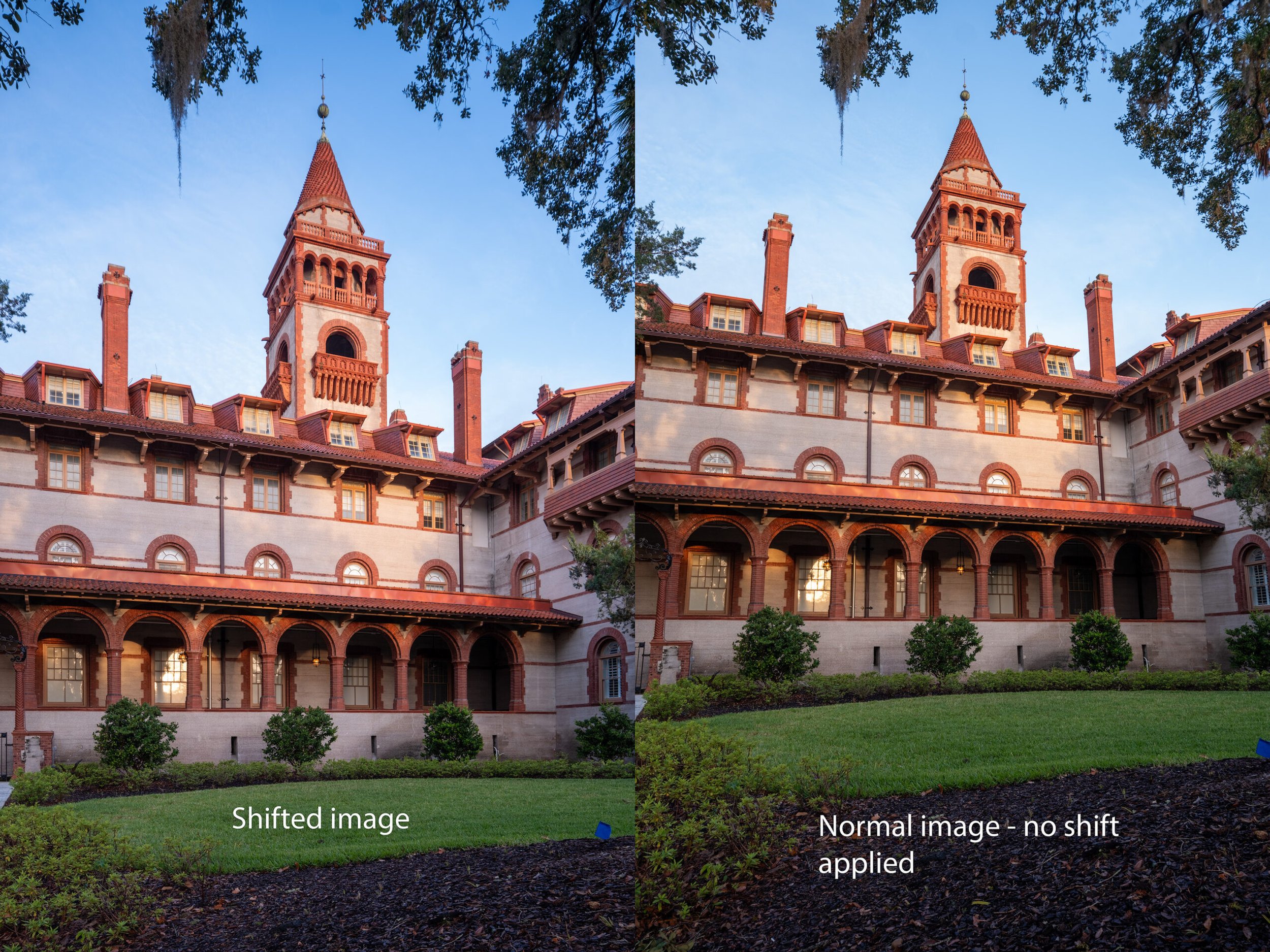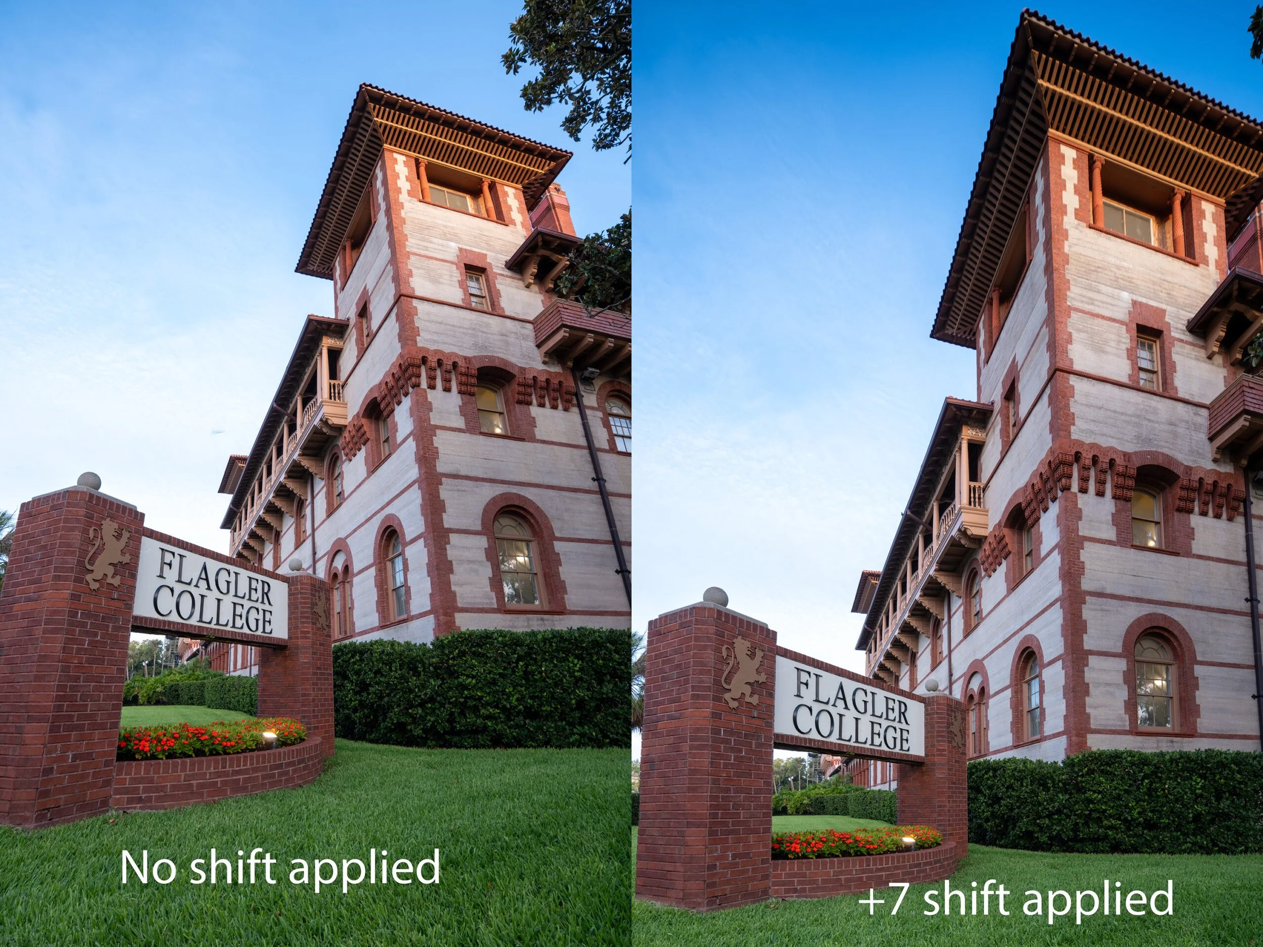 +7 shift upward: This is an extreme example, but shows how useful the shift can be. The vignette on the top of the shifted image was left intentionally to showcase what to expect at the extreme ends of the shift.