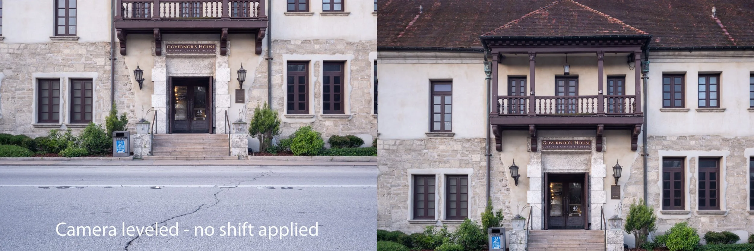 Small shift upward: I wanted to show that it’s not always a full shift adjustment that makes a big difference. The unshifted image leans back enough that it affects the overall look of the building. The shifted image is a much more pleasing result and helps make better use of the entire frame. Both images were shot with the exact same settings.