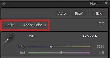 At the top of the Basic panel in Lightroom, you’ll find Profile — this determines how Lightroom interprets the RAW data from your camera. Think of it as the starting point for color and contrast before you begin editing.